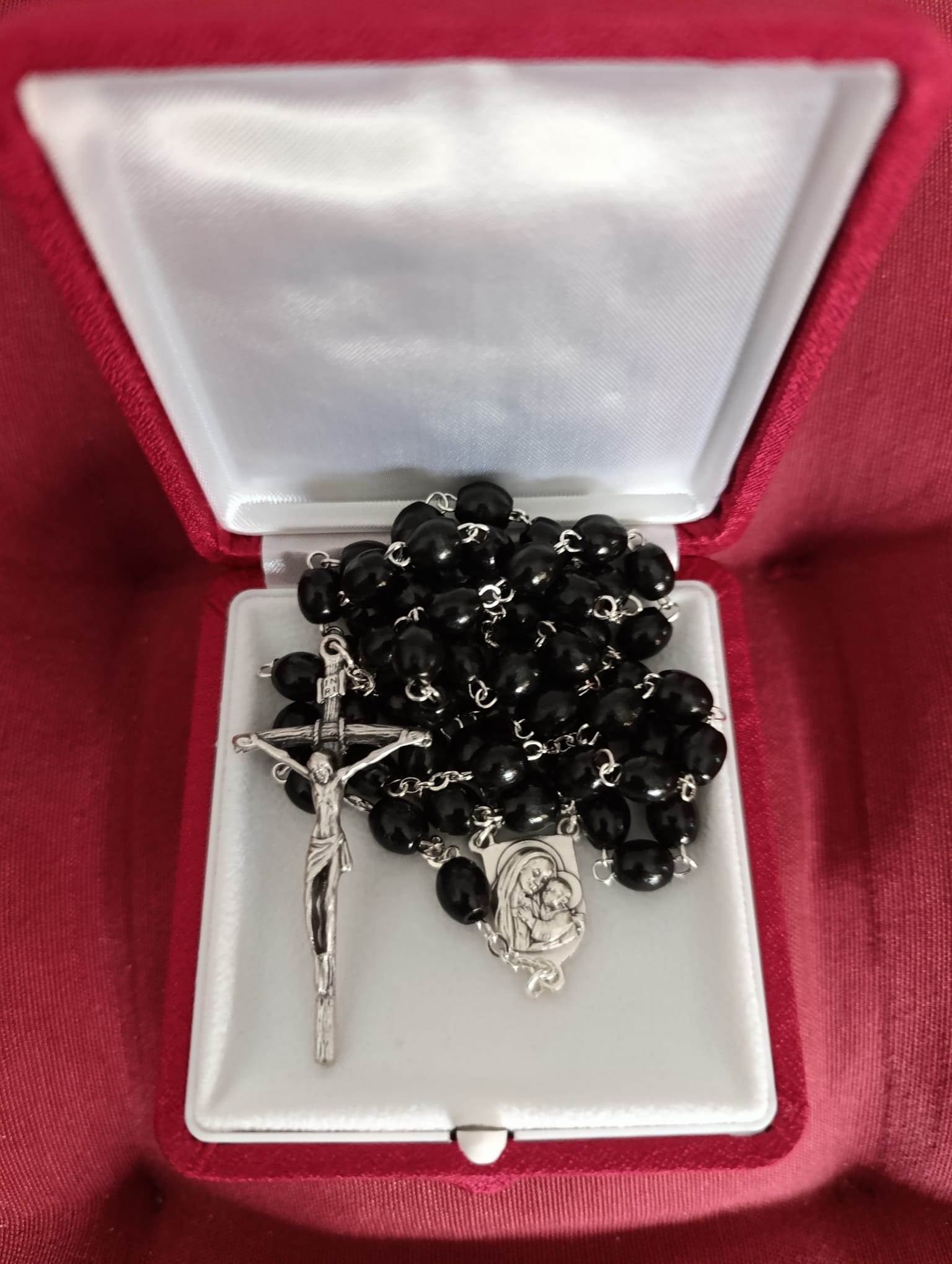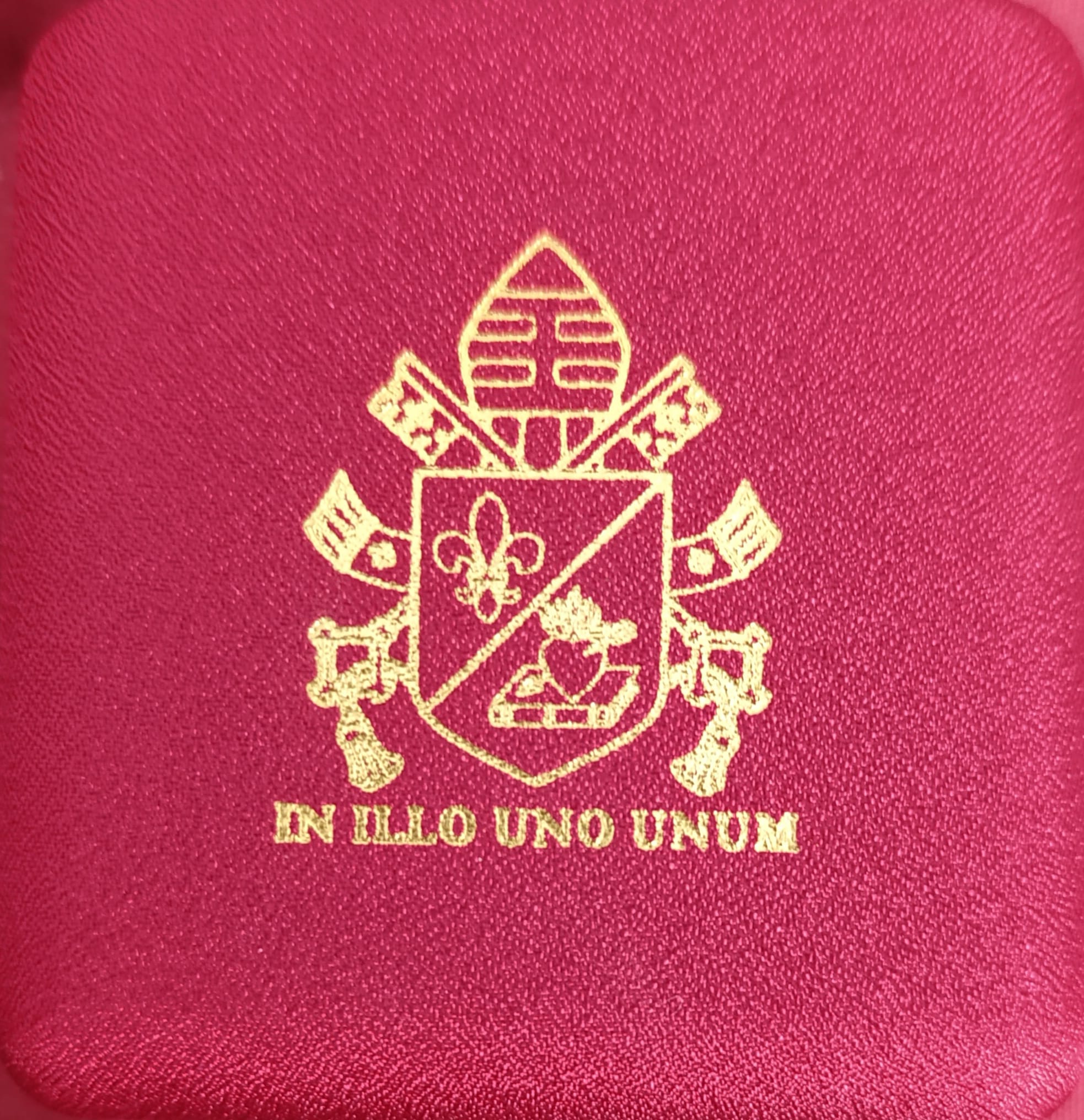 A continuación, León XIV nos entregó un rosario, en caja roja, sobre la cual lucía grabado en dorado el escudo papal, con su famosa leyenda «in illo uno unum» (S. Agustín, Com. Sal. 127,3). Emocionados y agradecidos todos le entregamos nuestra tarjeta con la actual dirección, que miró con interés.