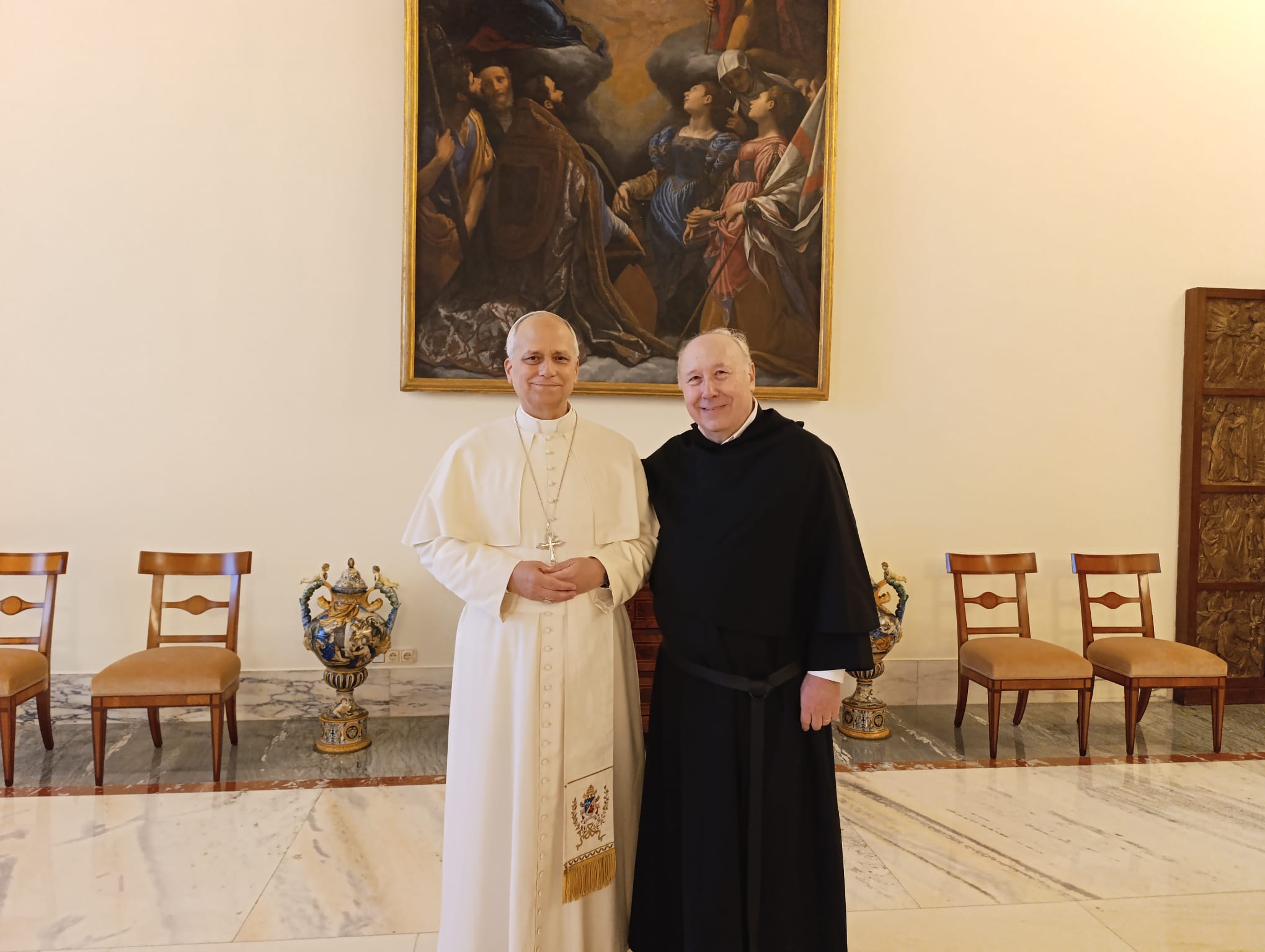 El P. Daniang me ofreció un sobre con rosarios, que agradecí sobremanera. El Papa León comentó el impresionante cuadro que decora la pared de su despacho, en el que aparece San Agustín y Santa Mónica. Le recordé que vaticiné su elección como Papa y que me alegré mucho de haber acertado. Nos hicimos varias fotos, que pasarán al recuerdo entrañable e inolvidable de nuestros corazones. La despedida fue agradecida y emocionada. El P. Rafael Espino solicitó su bendición personal. Nuestra última mirada fue seguida de un “hasta vernos en Madrid”.